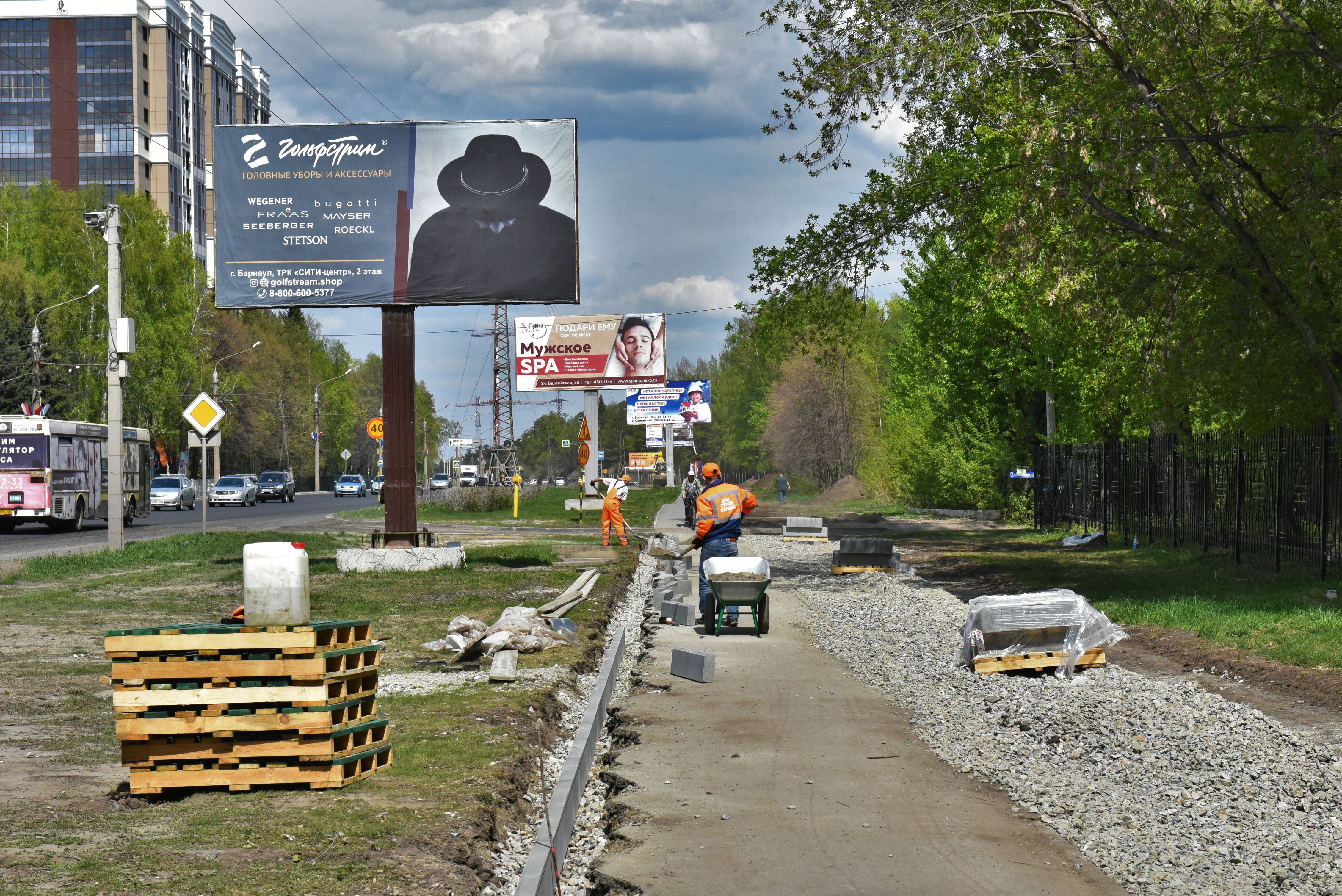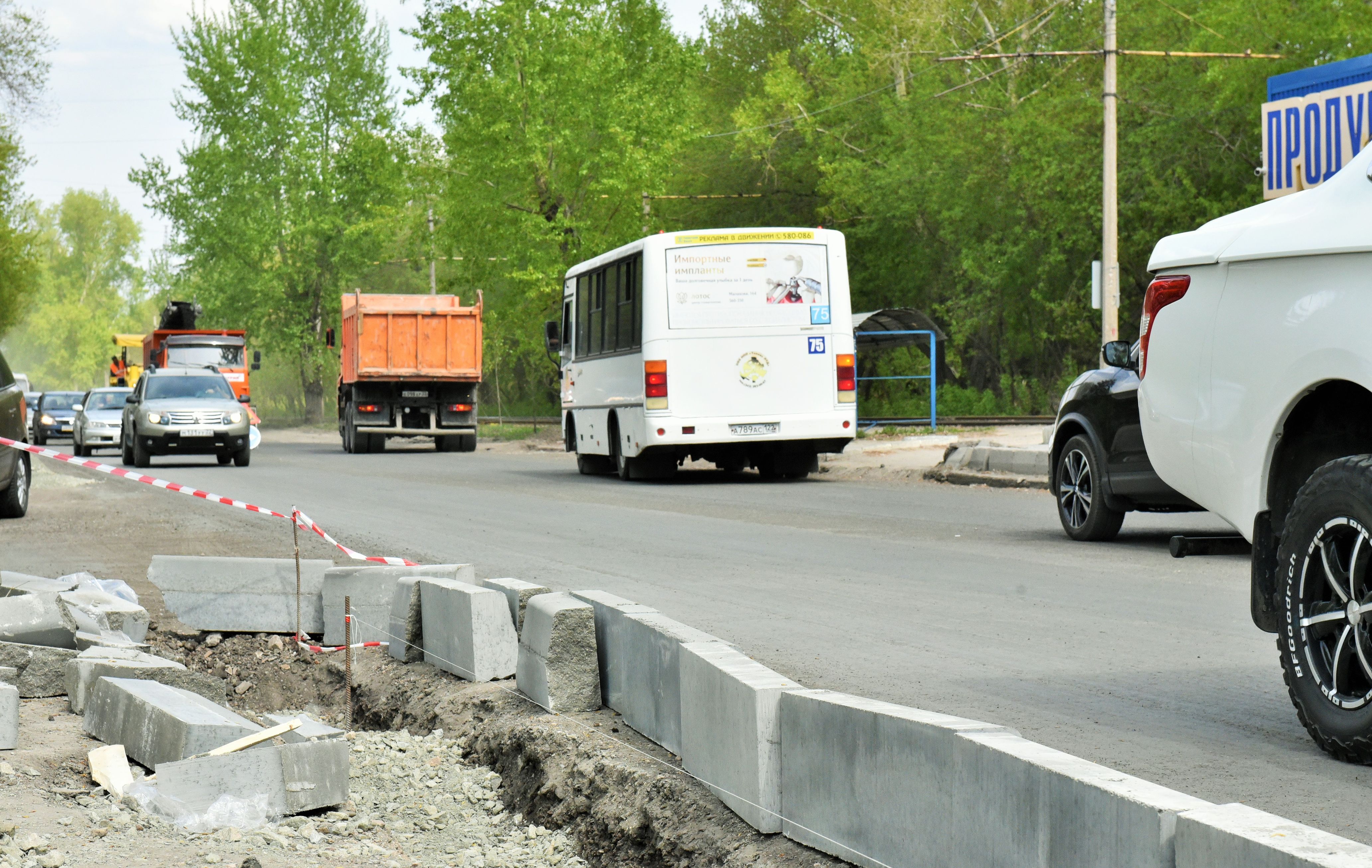 Продолжается ремонт Змеиногорского тракта, важнейшей транспортной артерии краевой столицы: в этом году ООО «Барнаульское ДСУ №4» отремонтирует участок от улицы Аванесова до улицы Горнолыжной. Рабочие устанавливают бордюры и поребрики, а в ночь велось устройство выравнивающего слоя покрытия.