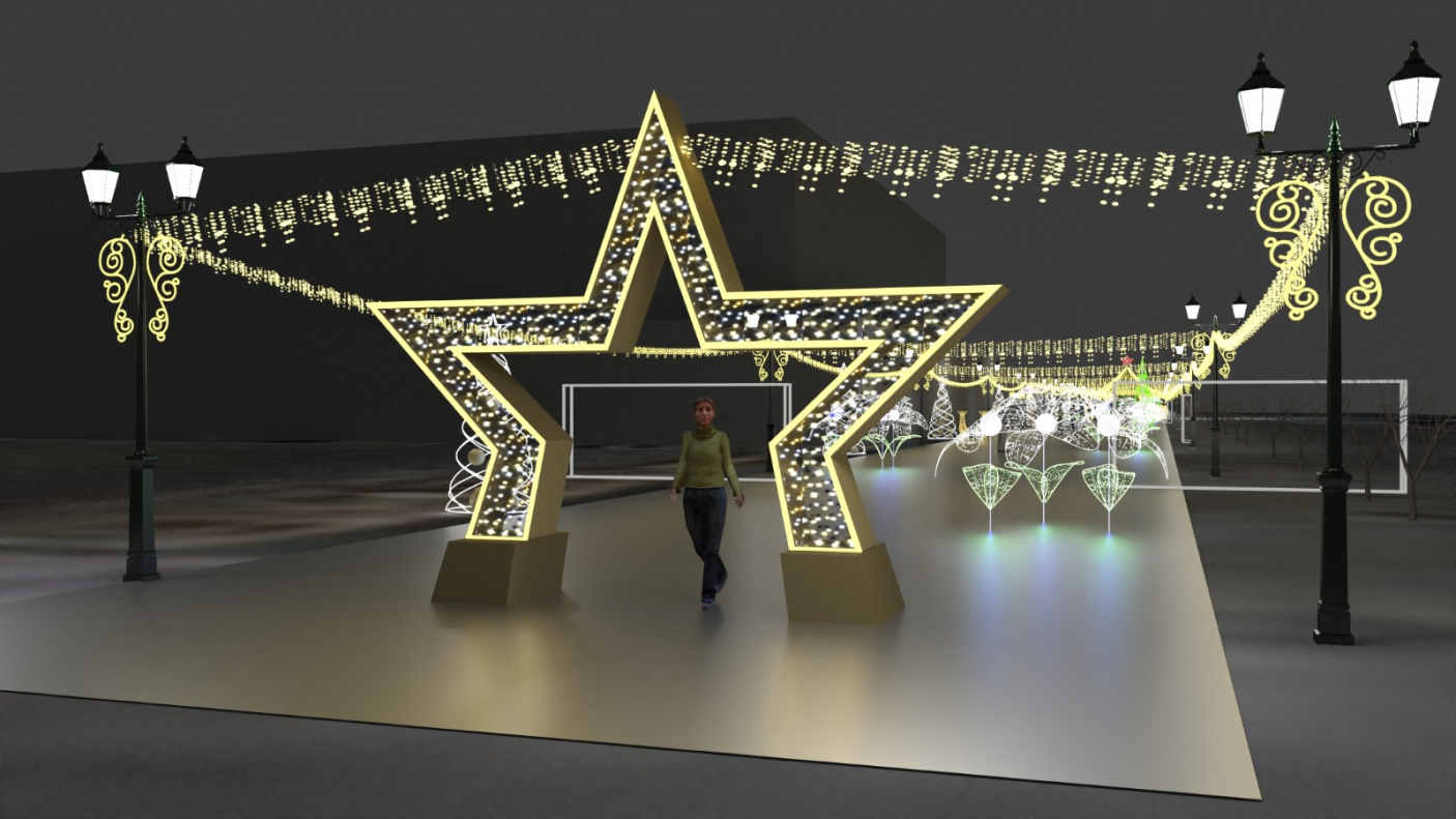 Вход в новогодний городок будет оформлен световыми композициями в виде звезд. Также прогулочная зона будет украшена гирляндами, светящимися елями, шарами, фигурами героев мультфильмов.