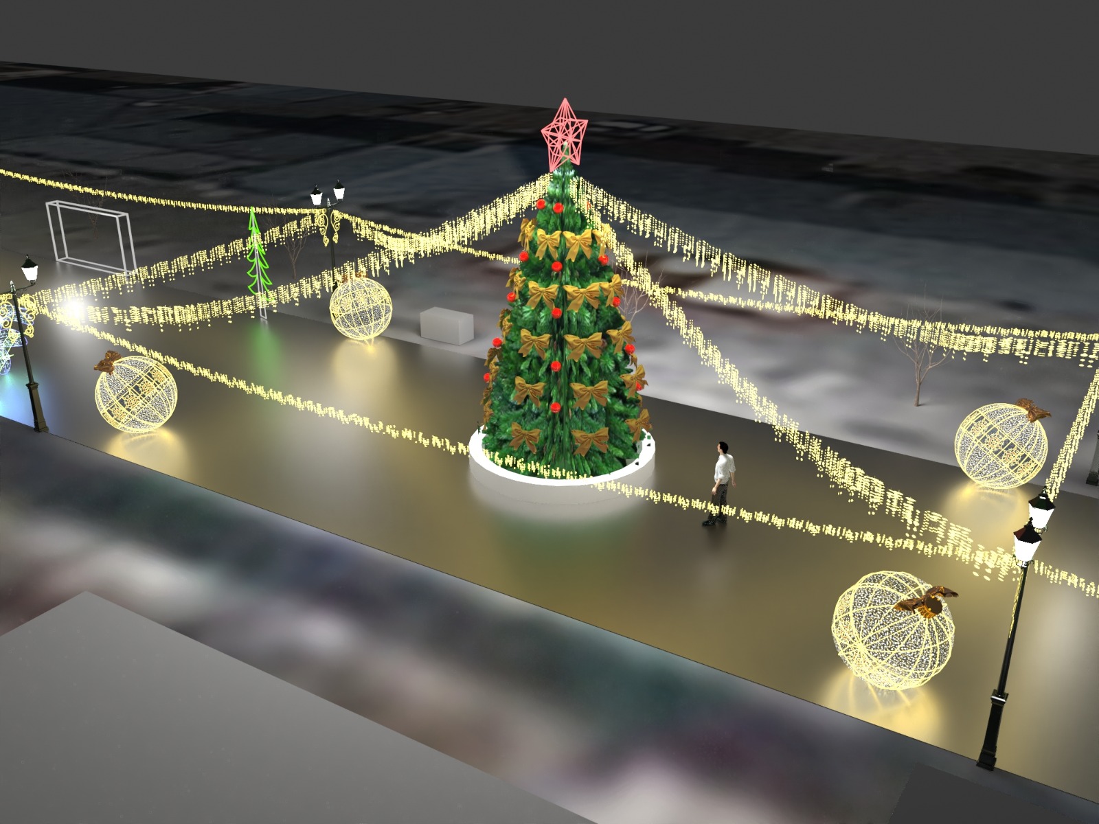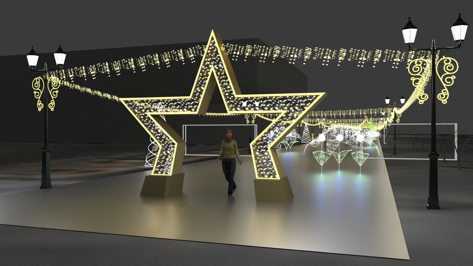 Вход в новогодний городок будет оформлен световыми композициями в виде звезд. Также прогулочная зона будет украшена гирляндами, светящимися елями, шарами, фигурами героев мультфильмов.
