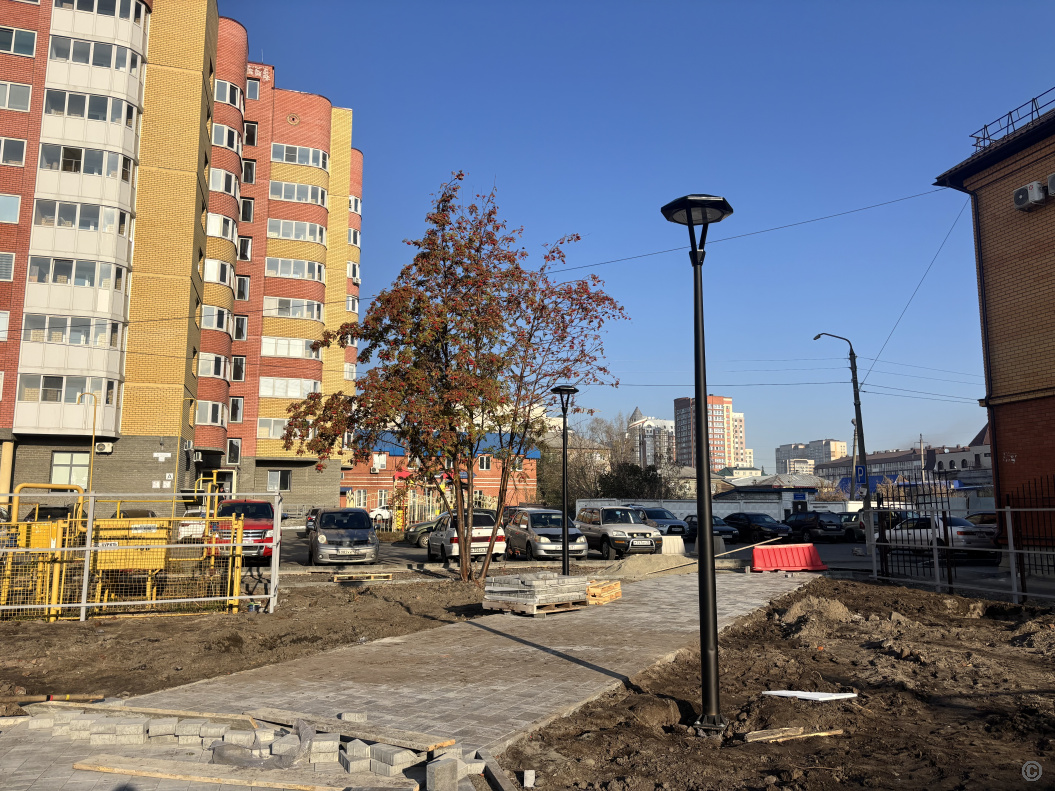 Ранее на участке выполнены работы по сносу аварийных деревьев, планировке участка, благоустройству пешеходных дорожек и устройству освещения.