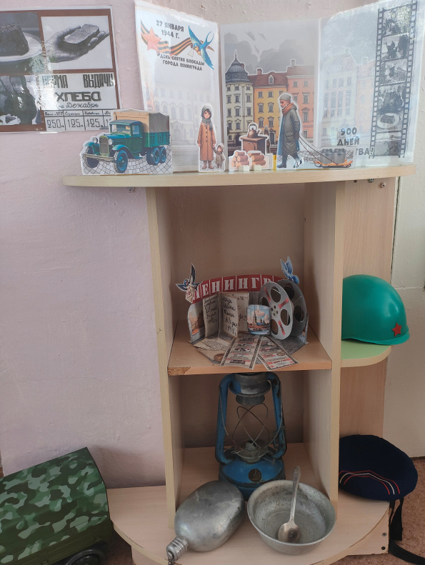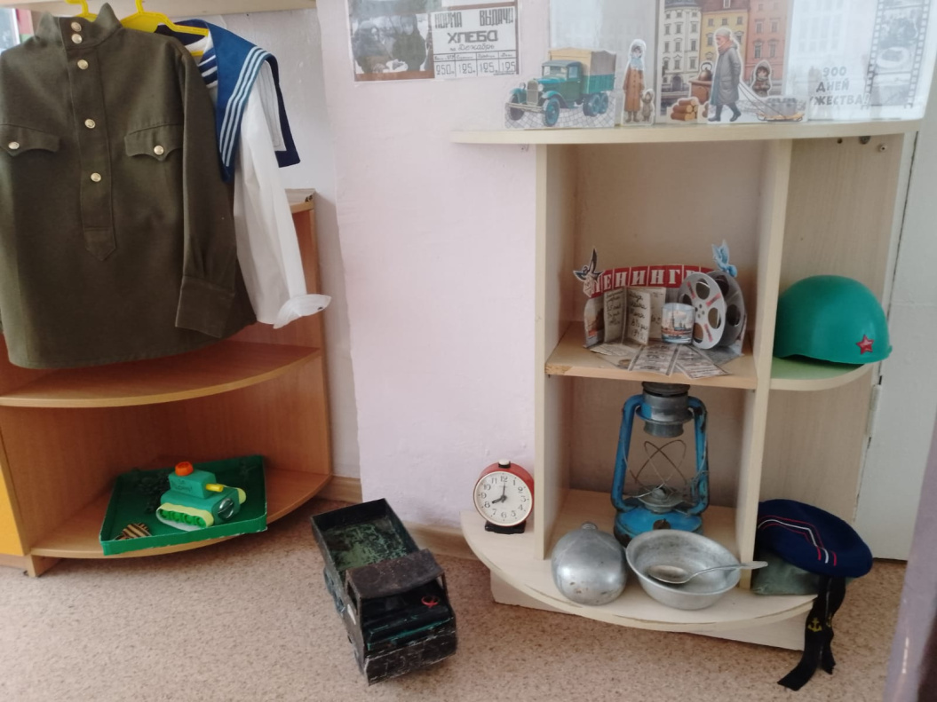 В детском саду музей создавали совместными усилиями педагоги, воспитанники и их родители, обсуждая его будущую тематику и наполняя его необычными экспонатами. Теперь его пространство разбито на тематические зоны: стена памяти «Помним! Чтим! Гордимся!», «Военная техника», «В блиндаже», «Юные герои ВОВ», «Блокада Ленинграда». Здесь есть макеты «Боевое поле» и «Поле битвы, военные действия». Также в экспозициях можно найти элементы воинского обмундирования, предметы солдатского быта, награды, портретные снимки и копии документов военных лет. Отдельно выделена библиотека тематических книг, соответствующих возрасту юных читателей.– Музей в дошкольной образовательной организации – самый совершенный институт воспитания, – считают педагоги. – Он представляет ценность не только музейными экспозициями и наличием уникальных артефактов, но и содержанием проводимой воспитательной работы с детьми.