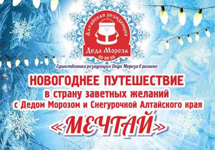 В свой День рождения, 18 ноября, Дед Мороз Алтайского края проведет первую экскурсию по своей резиденции. С этого дня и по 10 января для детей и взрослых будут ежедневно проводить познавательные экскурсии, спектакли, театрализованные представления. В этом году гости резиденции увидят 3D замок, волшебное дерево заветных желаний, музей Деда Мороза, карту сказочных объектов России, новогодние локации для фото-впечатлений.