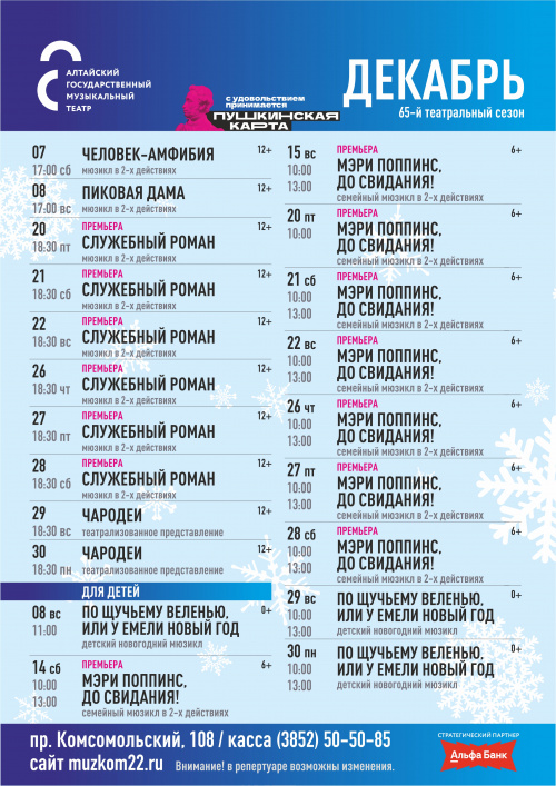 Алтайский музыкальный театр с 14 декабря приглашает на семейный мюзикл «Мэри Поппинс, до свидания!». По традиции на сцене перед спектаклем зрителей ждет встреча с Делом Морозом и Снегурочкой.