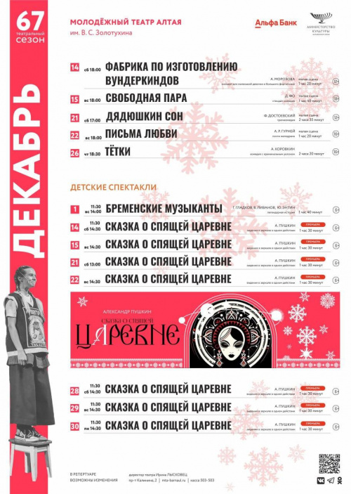 В Молодёжном театре Алтая зрителей ждут на просмотр «Сказки о спящей Царевне» Александра Пушкина, а со 2 по 8 января пройдут показы еще одного премьерного спектакля - «Брачная Лихорадка» по рассказам Антона Чехова.