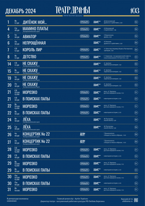 С 21 декабря новогодняя кампании стартует в Алтайском краевом театре драмы им. В.М. Шукшина. По традиции здесь пройдет главная Губернаторская елка края, в рамках которой школьникам региона и всем желающим покажут премьерную сказку «Морозко». Кроме этого, в театре драмы для зрителей готовят увлекательную новогоднюю историю «В поисках папы».