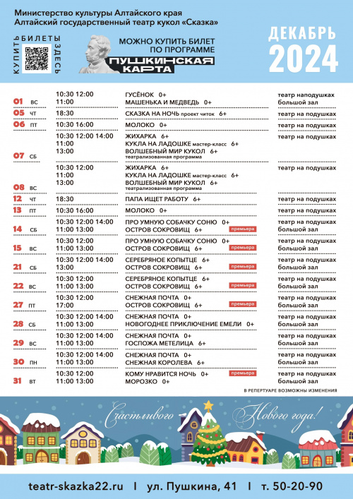 В Алтайском театре кукол «Сказка» новогоднюю кампанию откроет премьерный спектакль «Остров сокровищ», показы которого пройдут 14, 15, 21, 22, 27 декабря в большом зале. А самых маленьких зрителей ждут на премьерный спектакль «Кому нравится ночь» 31 декабря и 2, 6, 7 января. Всего в театре кукол в новогоднюю кампанию состоится 136 показов!
