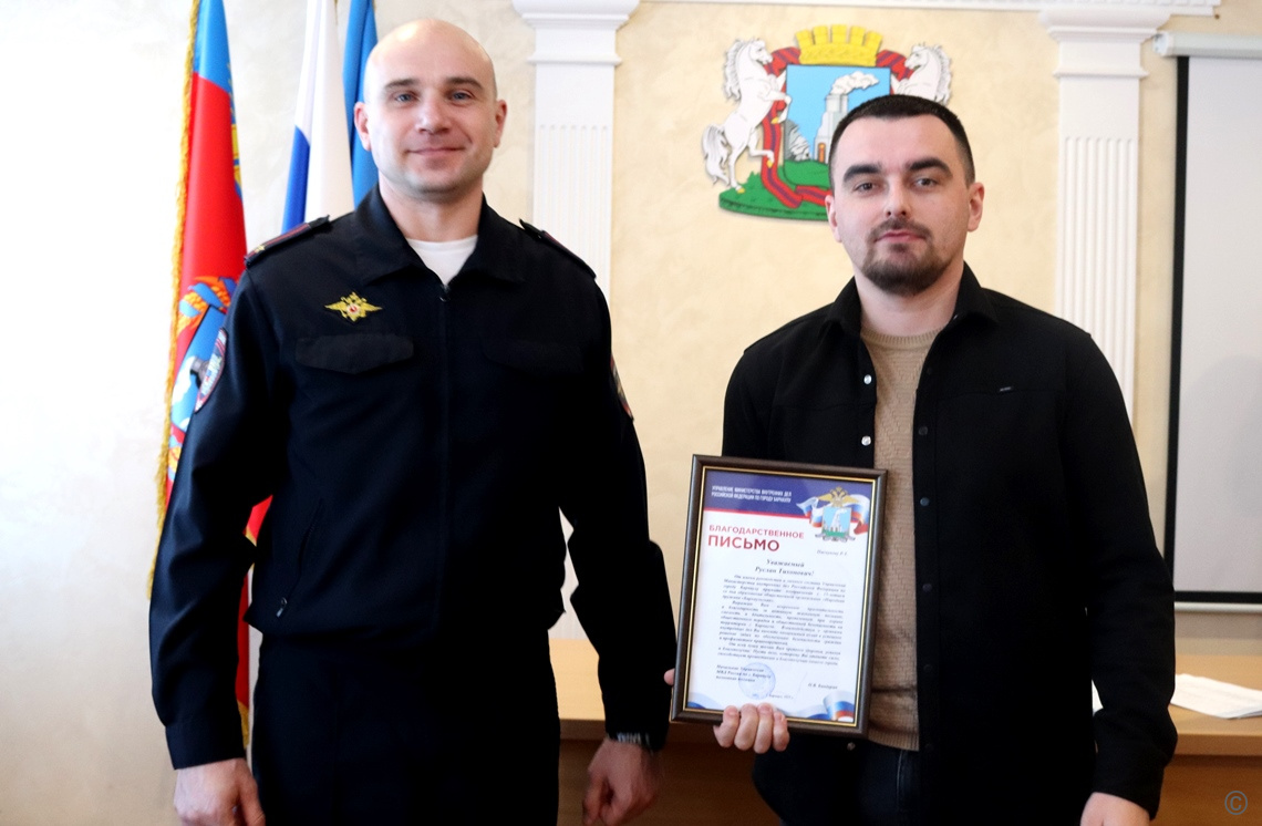 Также за активную жизненную позицию, смелость и бдительность, проявленные при охране общественного порядка Антон Викторович вручил Благодарственное письмо начальника управления МВД России по г.Барнаулу исполнительному директору Федерации ММА Алтайского края, дружиннику Ленинского отряда Руслану Пискунову.