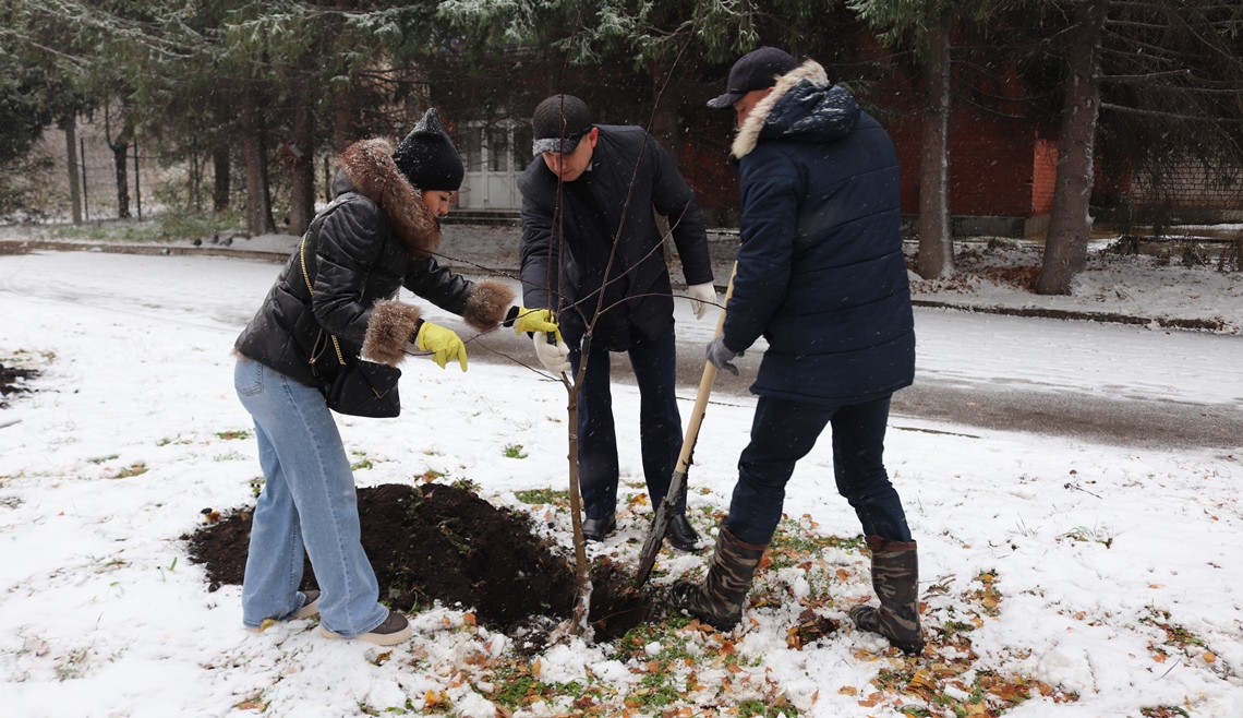 30 белых и красных яблонь и 30 пихт были высажены вдоль центральной аллеи с соблюдением всех агротехнических норм, расстояний до коммуникаций, тротуаров и проезжей части.