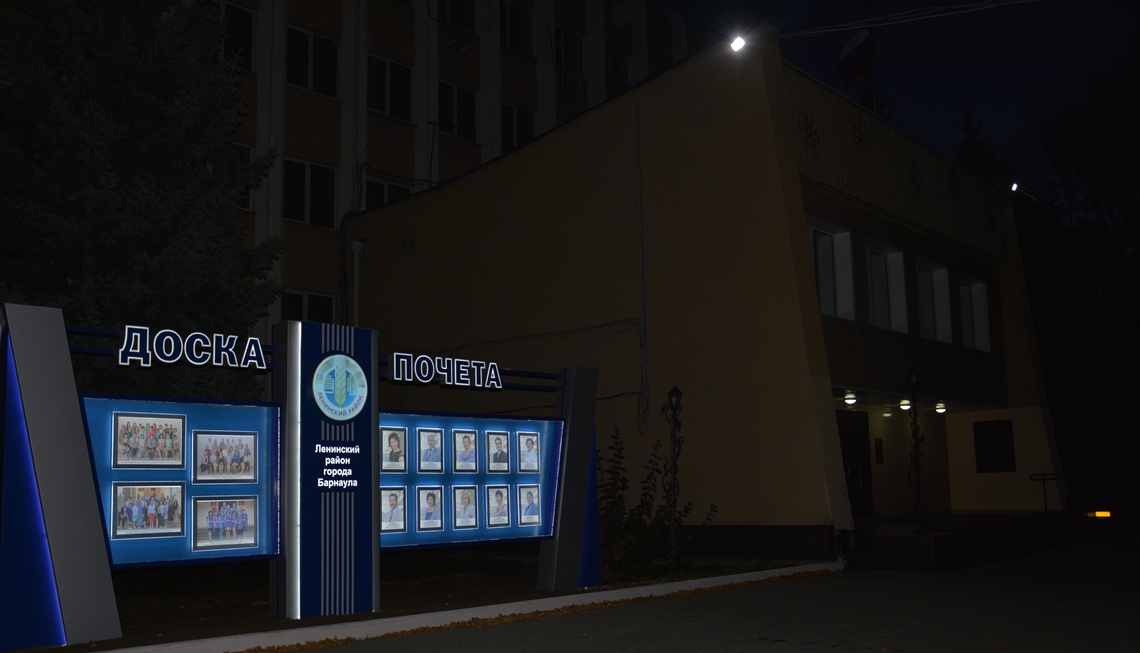 Новая Доска Почета выполнена в той же цветовой гамме, что и предыдущая, и установлена на том же месте. Теперь конструкция подсвечивается в темное время суток. На ней предусмотрено размещение фотографий десяти барнаульцев и четырех коллективов организаций района.