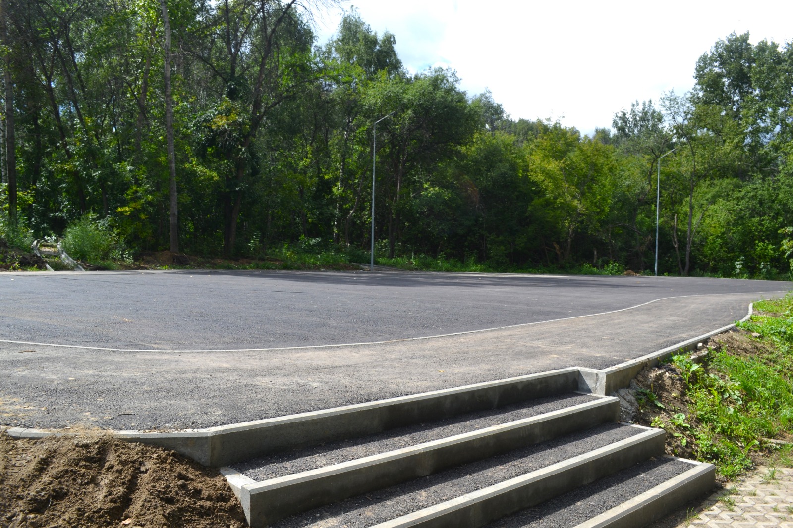 Рабочие продолжают обустраивать пешеходные дорожки, в том числе укладывают поребрики и плиточное покрытие. Также продолжается организация площадок для активного отдыха, в том числе для скейт-парка и памп-трека, установка спортивных тренажеров, стартовало обустройство детской игровой площадки. Кроме того, ведутся работы по устройству наружного освещения, рабочие прокладываю кабель и устанавливают опоры.
