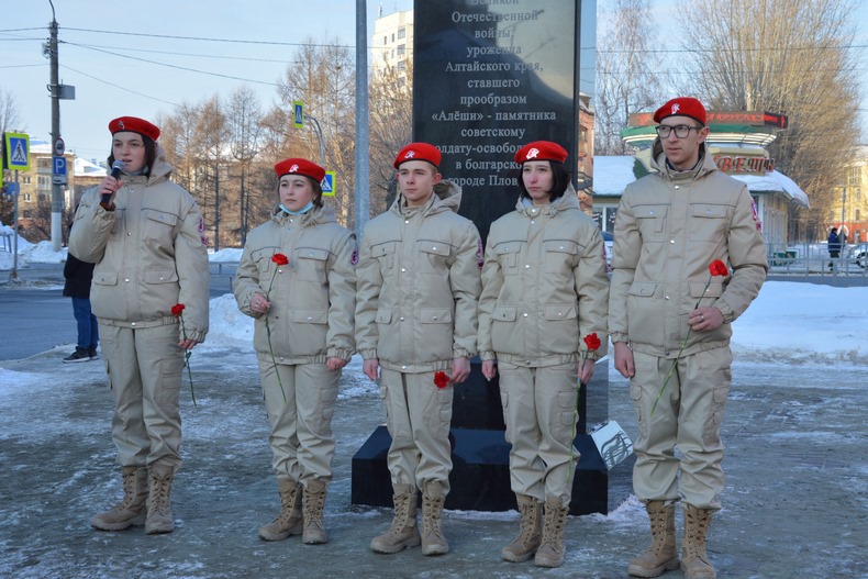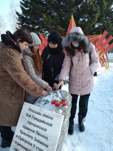 Студенты Алтайской академии гостеприимства также почтили память бойцов и возложили цветы к памятному знаку в честь 5-ой Гвардейской Городской стрелковой дивизии.