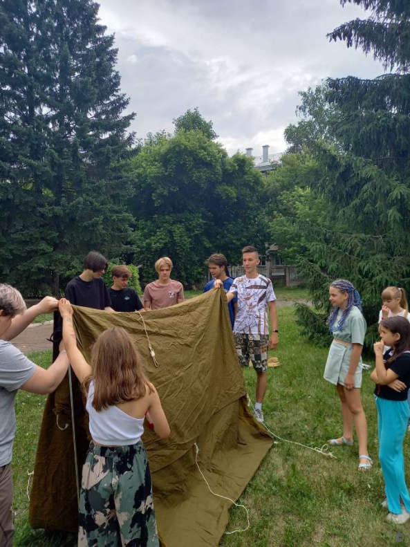 Участники соревновались в викторине на знание знаков безопасности, примеряли экипировку пожарного, учились устанавливать туристическую палатку, завязывать различные виды узлов, а также преодолевали навесную переправу по параллельным перилам.