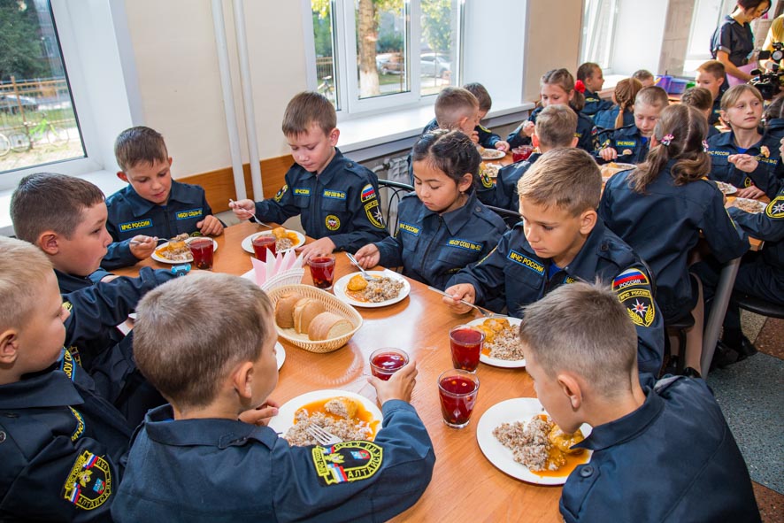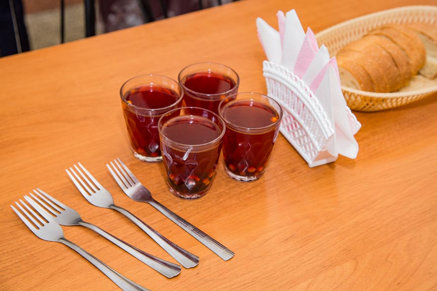 Директор школы №52 Татьяна Пономарева провела для участников встречи экскурсию по столовой. На перемене ребятам накрыли столы: сегодня в меню тефтели и каша, также подают хлеб и булочки, в качестве напитка – кисель. На вопросы, нравится ли еда, младшеклассники отвечают: вкусно!
