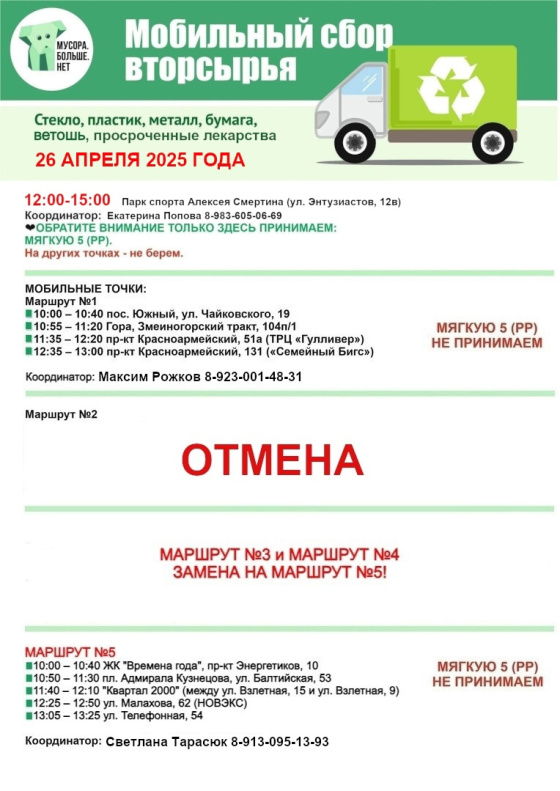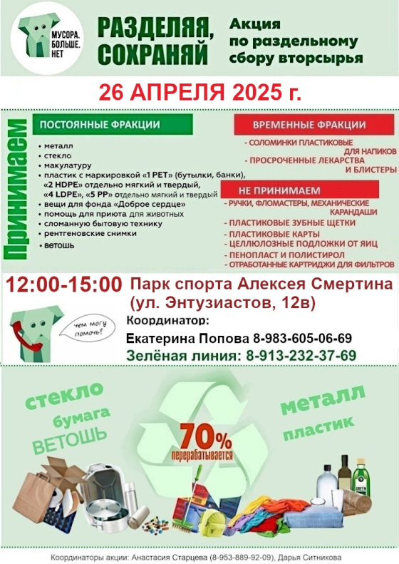 В субботу, 26 апреля, в Барнауле вновь пройдёт экологическая акция по раздельному сбору отходов «Разделяя сохраняй!». Организаторами мероприятия выступает общественная организация «Мусора.Больше.Нет» при поддержке комитета по благоустройству города.