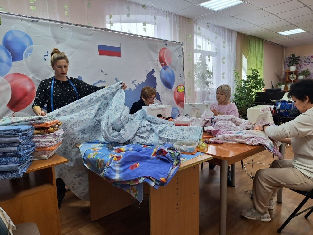 Жители п.Казенная Заимка регулярно принимают участие в благотворительных акциях. В помещении ТОС посёлка продолжается работа по изготовлению постельного белья для госпиталей.