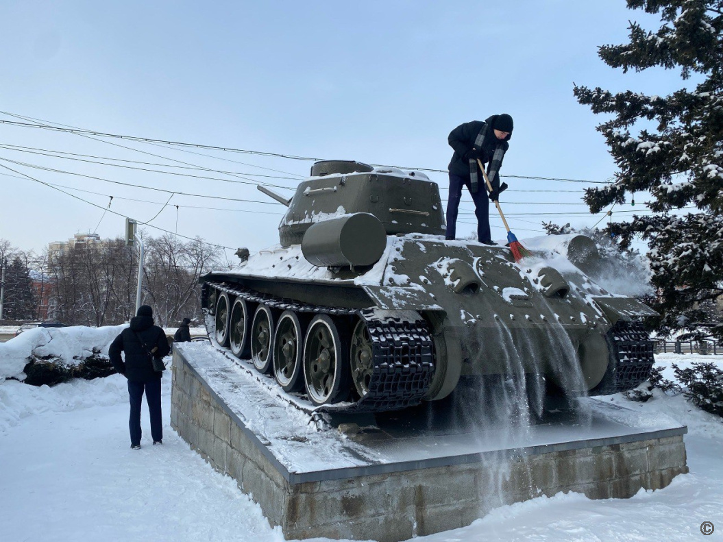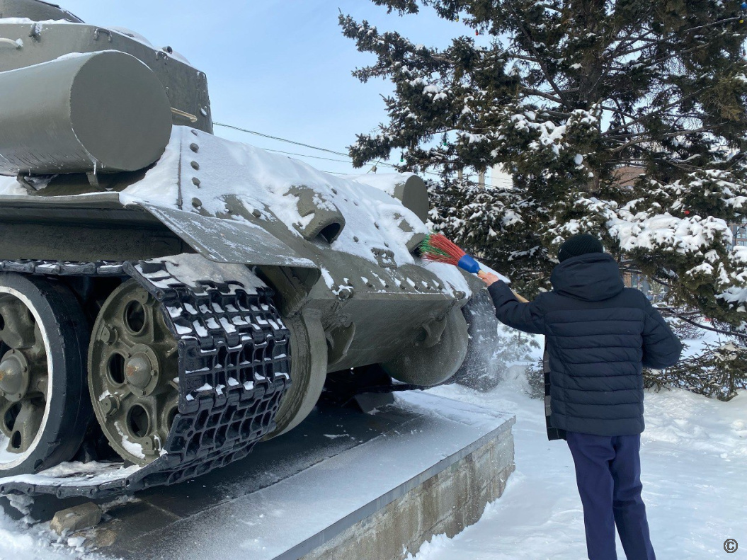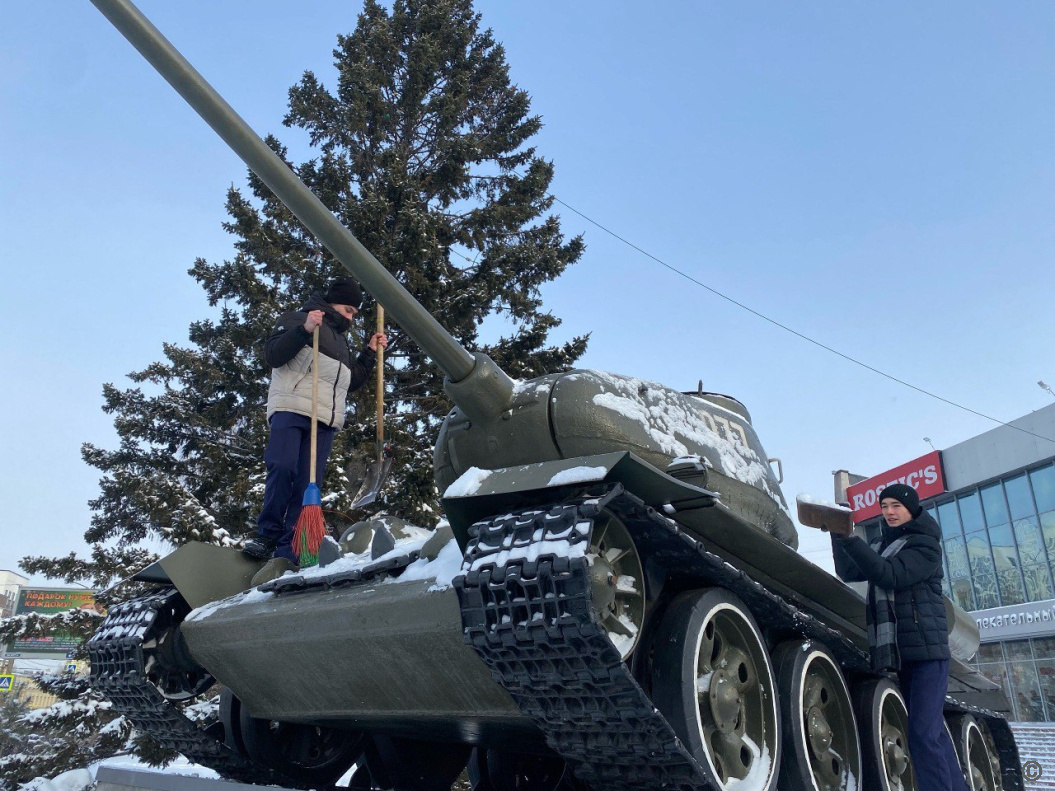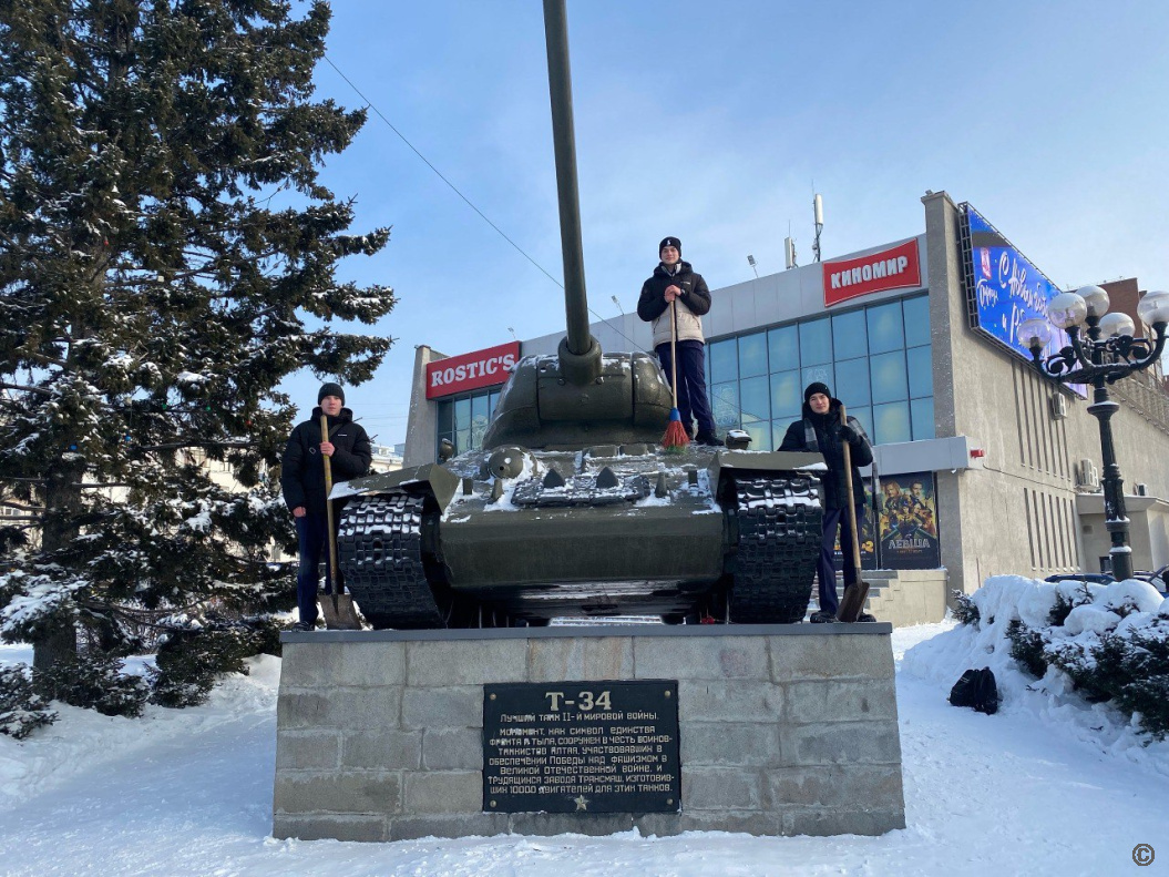Кроме того, учащиеся Барнаульского лицея железнодорожного транспорта продолжили добрую традицию, очистив от снега памятник легендарному танку Т-34, расположенному на бульваре Защитников Сталинграда.