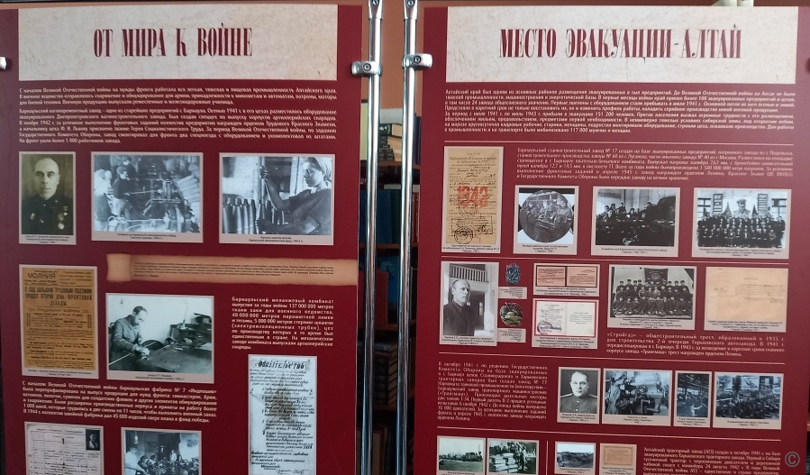Выставка, охватывающая историю Барнаула в годы Великой Отечественной войны и созданная по материалам фондового собрания, состоит из семи тематических разделов: «Тыловые будни края», «От мира к войне», «Место эвакуации – Алтай», «Хлеб – это Победа!», «В Фонд обороны», «Вдохновляющие к Победе» и «Победа! Одна на всех…».