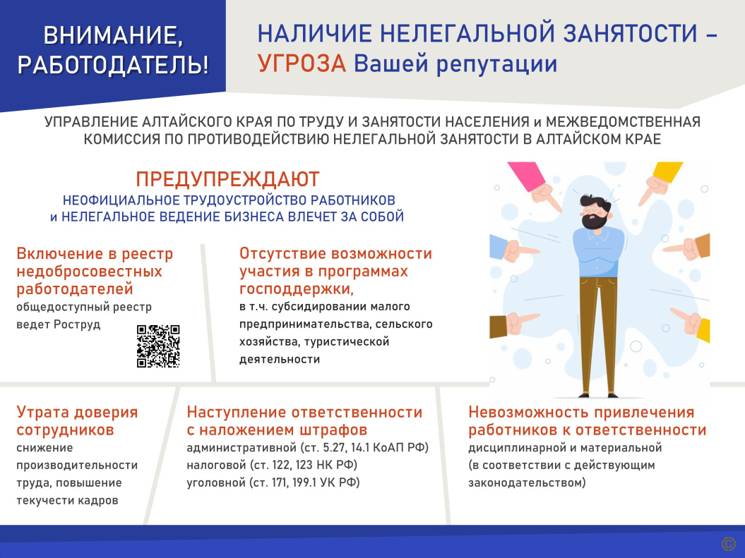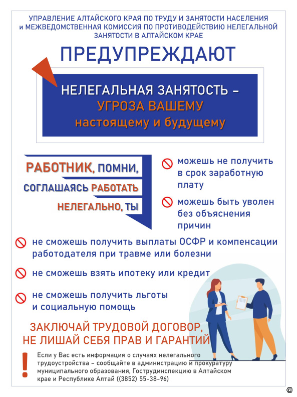 Управление Алтайского края по труду и занятости населения и межведомственная комиссия по противодействию нелегальной занятости в Алтайском крае подготовили памятки на эту тему.