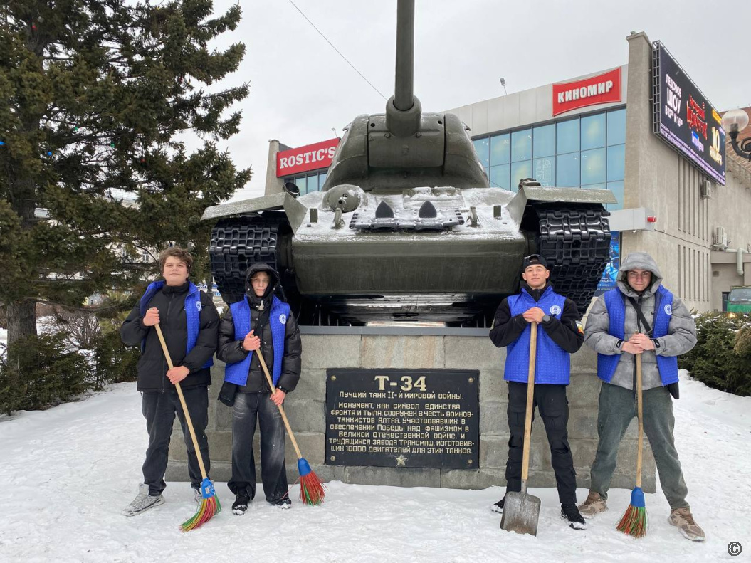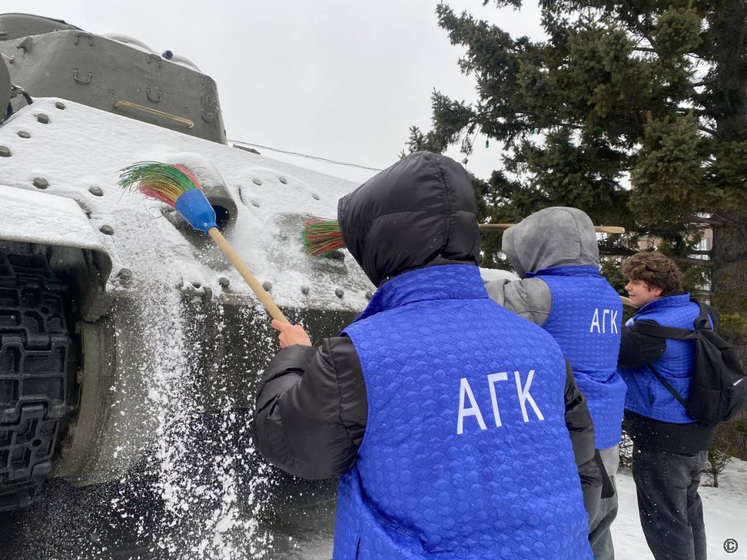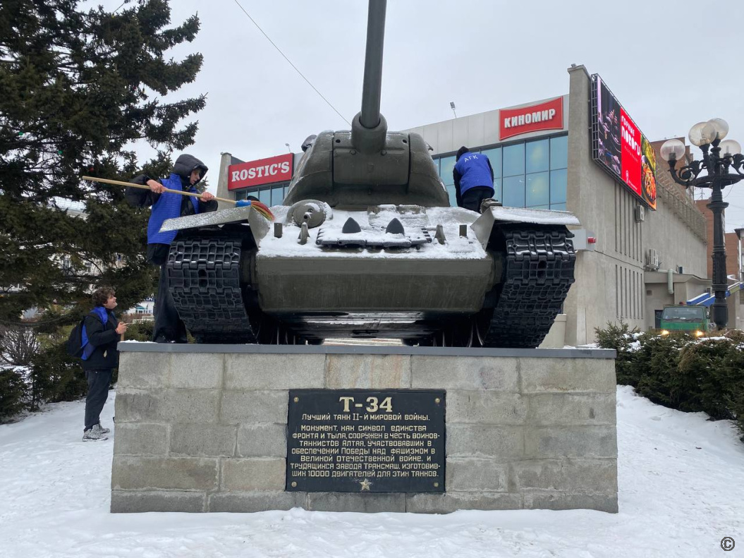 В рамках патриотической акции, приуроченной ко Дню Неизвестного Солдата, волонтеры Алтайского государственного колледжа провели очистку танка Т-34 на бульваре защитников Сталинграда у кинотеатра «Мир».