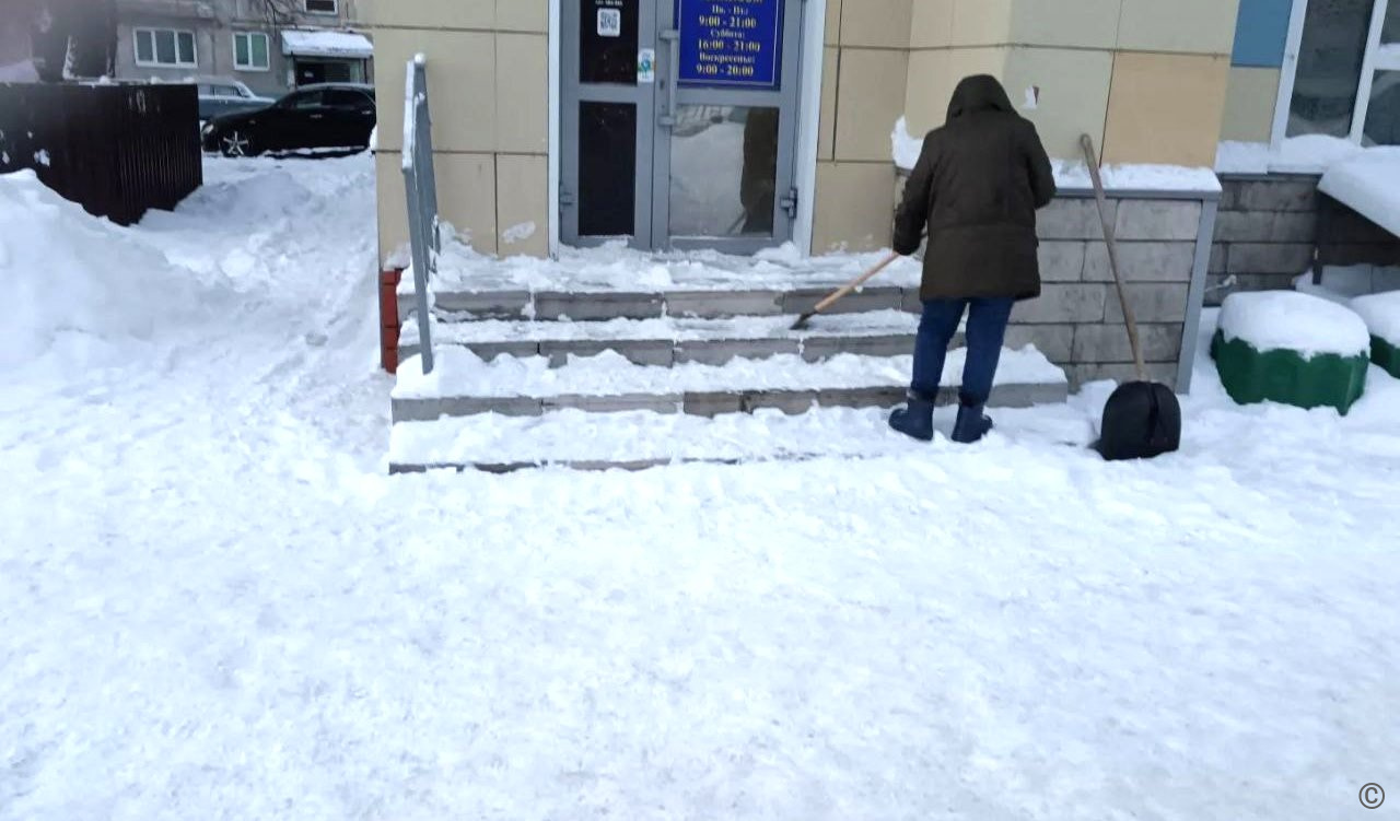 Предприятия потребительского рынка вывели дворников на очистку входных групп и прилегающих территорий от снега.