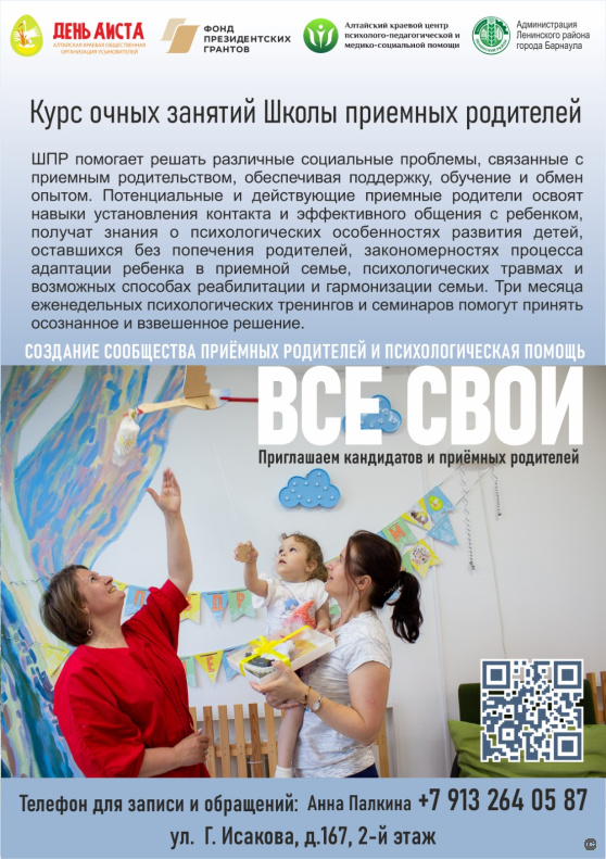 Алтайский краевой центр психолого-педагогической помощи осуществляет взаимодействие с социально-ориентированными некоммерческими организациями, способными оказать различные виды помощи замещающим семьям. Ведущая организация в Алтайском крае – Алтайская краевая общественная организация усыновителей «День аиста», работающая в интересах замещающих семей и детей, воспитывающихся в таких семьях, начинает реализацию проекта «ВСЕ СВОИ. Создание сообщества приёмных родителей и психологическая помощь», цель которого – улучшение состояния детско-родительских отношений в замещающих семьях и повышение родительских компетенций.