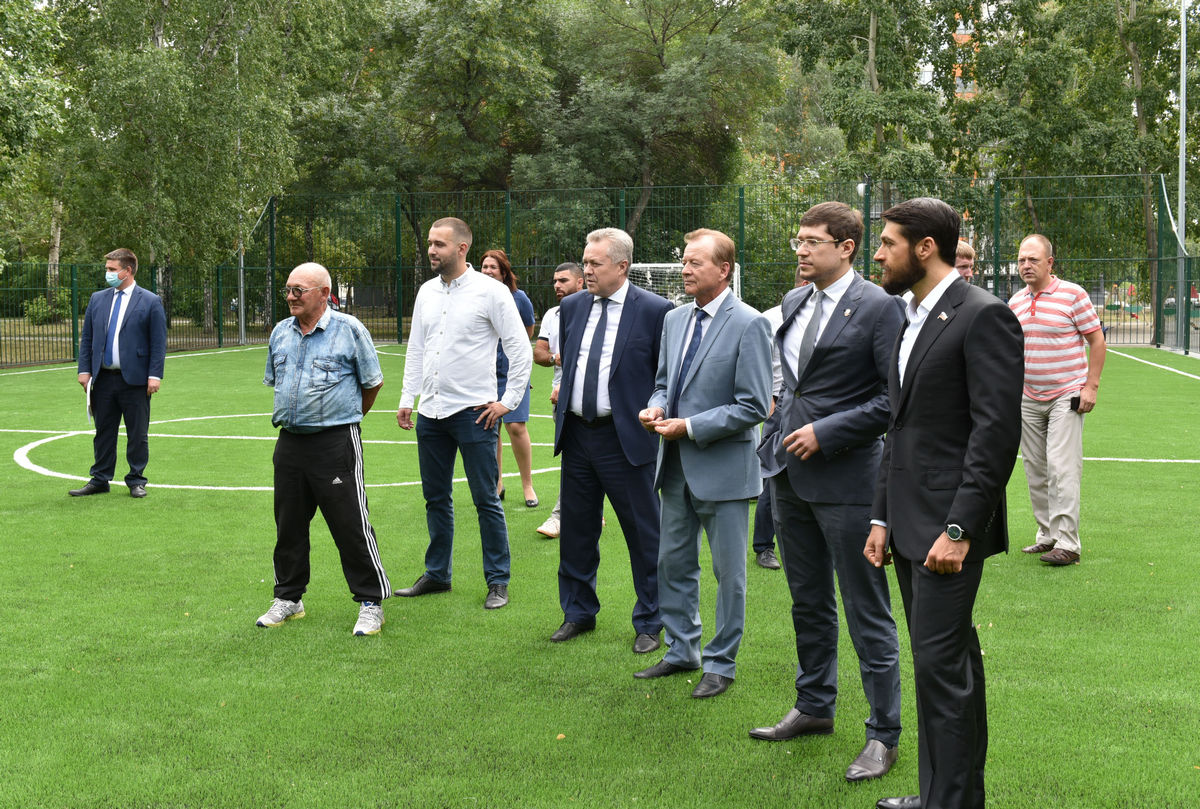 Заместитель главы администрации Барнаула по социальной политике Александр Артемов, депутат Государственной думы Александр Прокопьев, председатель попечительского совета фонда Владимира Шаманова «Защитники Отечества» Артем Шамков совместно с главой администрации Октябрьского района Вячеславом Новиковым оценили готовность спортивной площадки к открытию.