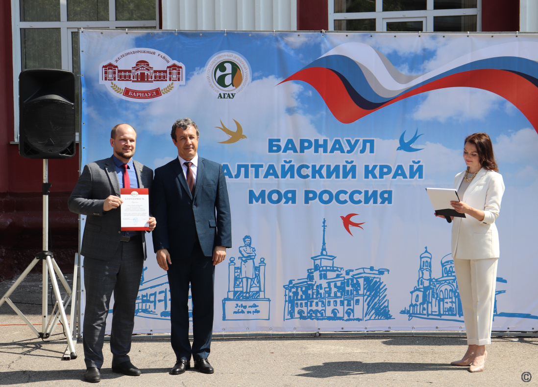 На площадке перед корпусом «Алтайского государственного аграрного университета» 10 июня пять школьников получили свой главный документ из рук главы администрации Железнодорожного района Андрея Данькина.