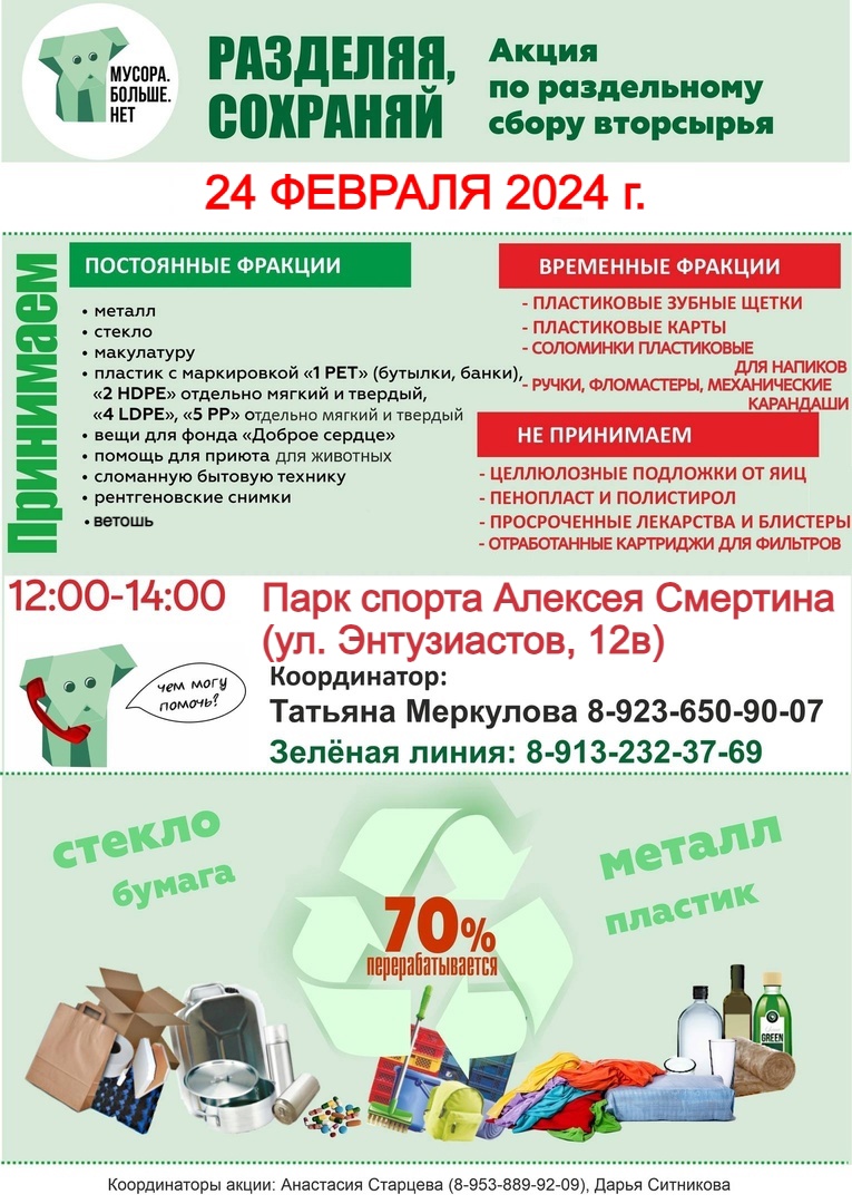 24 февраля состоится первая в этом году экологическая акция по раздельному сбору отходов «Разделяя сохраняй!». Организаторами мероприятия выступает общественная организация «Мусора.Больше.Нет» при поддержке комитета по благоустройству города Барнаула.