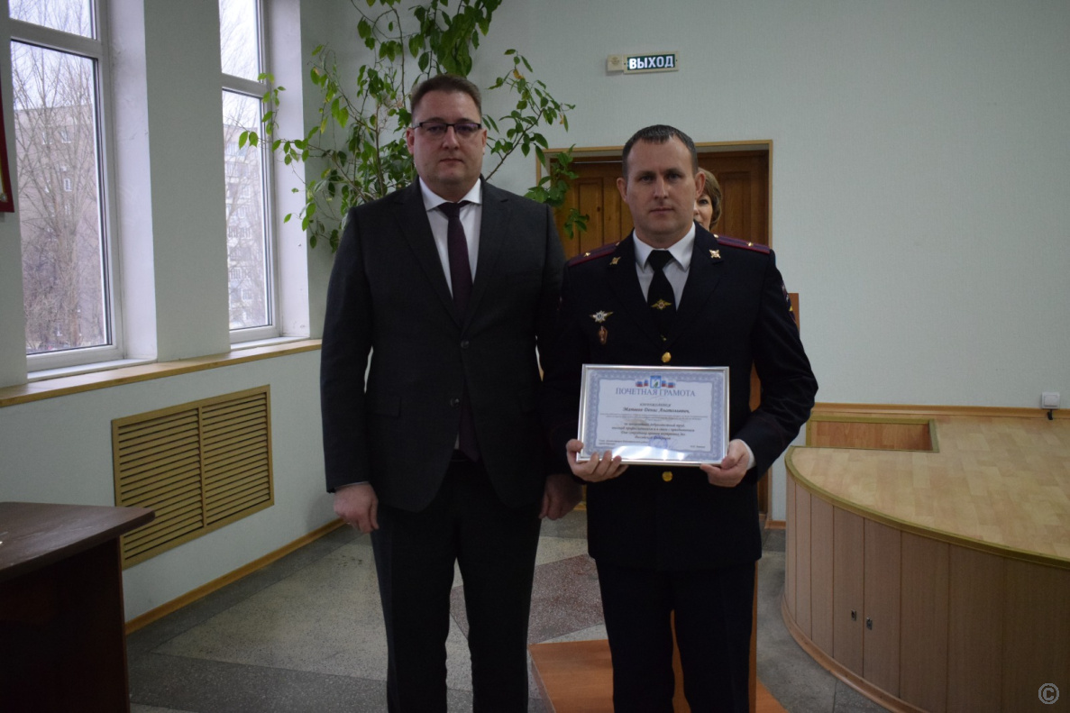 В торжественной обстановке глава администрации Индустриального района Денис Летягин вручил почетные грамоты сотрудникам: Шпак Ольге Александровне, старшему дознавателю отдела дознания, Матвееву Денису Анатольевичу, начальнику отделения по микрорайону «Мирный» отдела участковых уполномоченных полиции и по делам несовершеннолетних, Артемьевой Анне Николаевне, заместителю начальника отдела участковых уполномоченных полиции и по делам несовершеннолетних.
