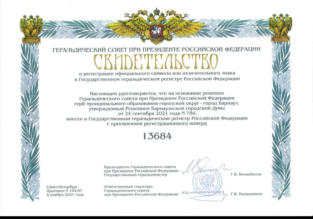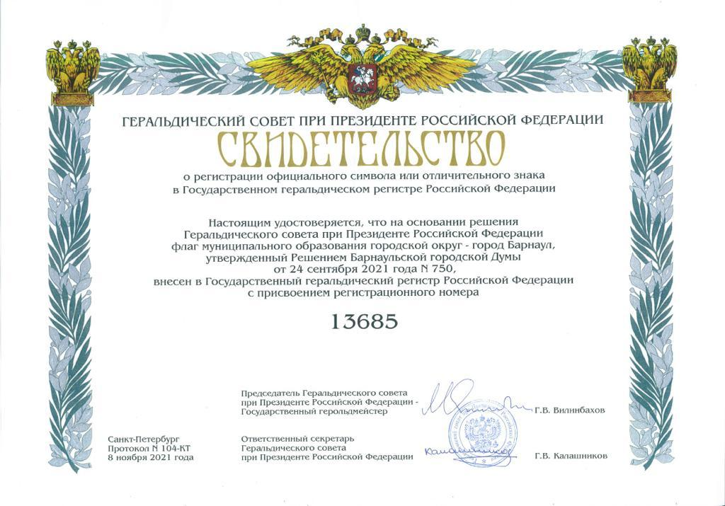 Официальные символы (герб и флаг) города Барнаула зарегистрированы Геральдическим советом при Президенте Российской Федерации (протокол от 08.11.2021 №104-КТ) в Государственном геральдическом регистре Российской Федерации. Гербу города Барнаула присвоен регистрационный номер 13684, флагу города Барнаула - 13685.