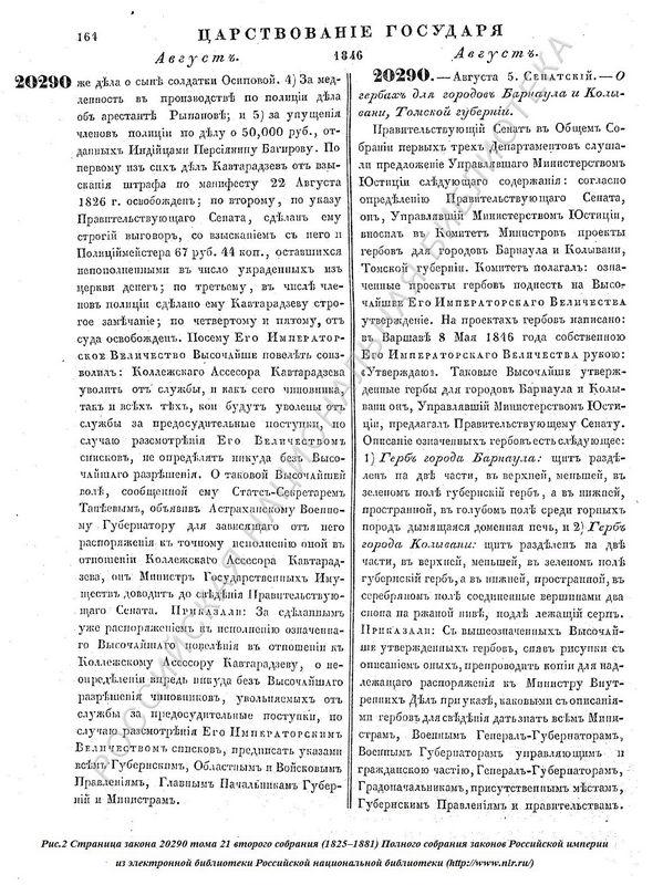 Описание герба города Барнаула 1846 года приведено в законе 20290 тома 21 второго собрания (1825–