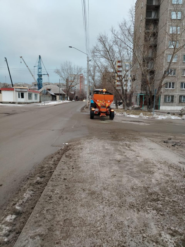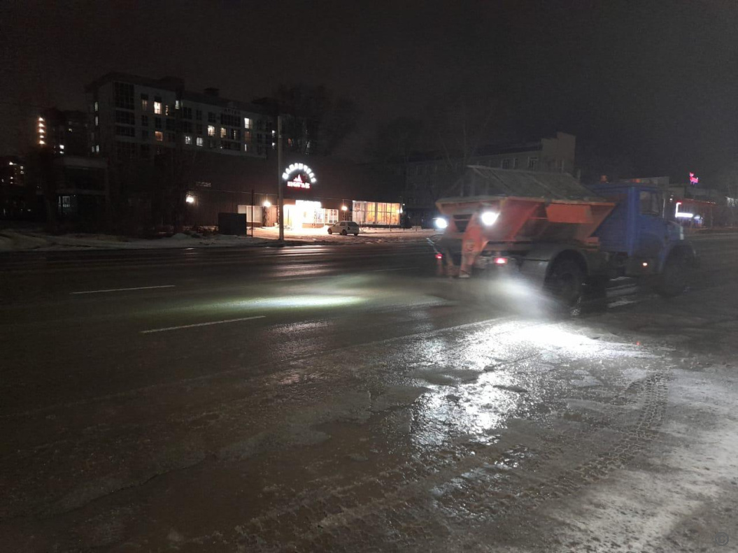 В связи с понижением температуры воздуха и обильными осадками в виде дождя и мокрого снега накануне наблюдается подмерзание поверхностей дорог и тротуаров. Для безопасности передвижения транспорта и пешеходов дорожная служба проводит посыпку улично-дорожной сети.