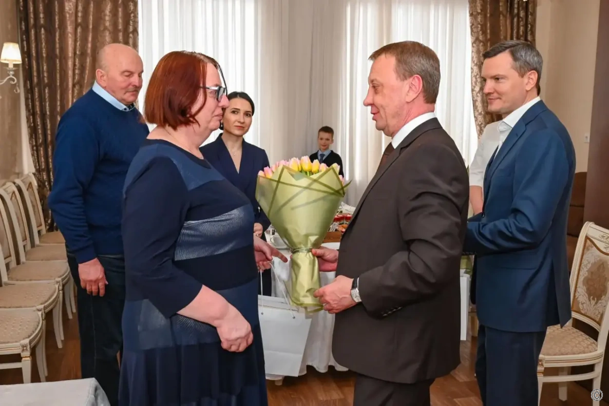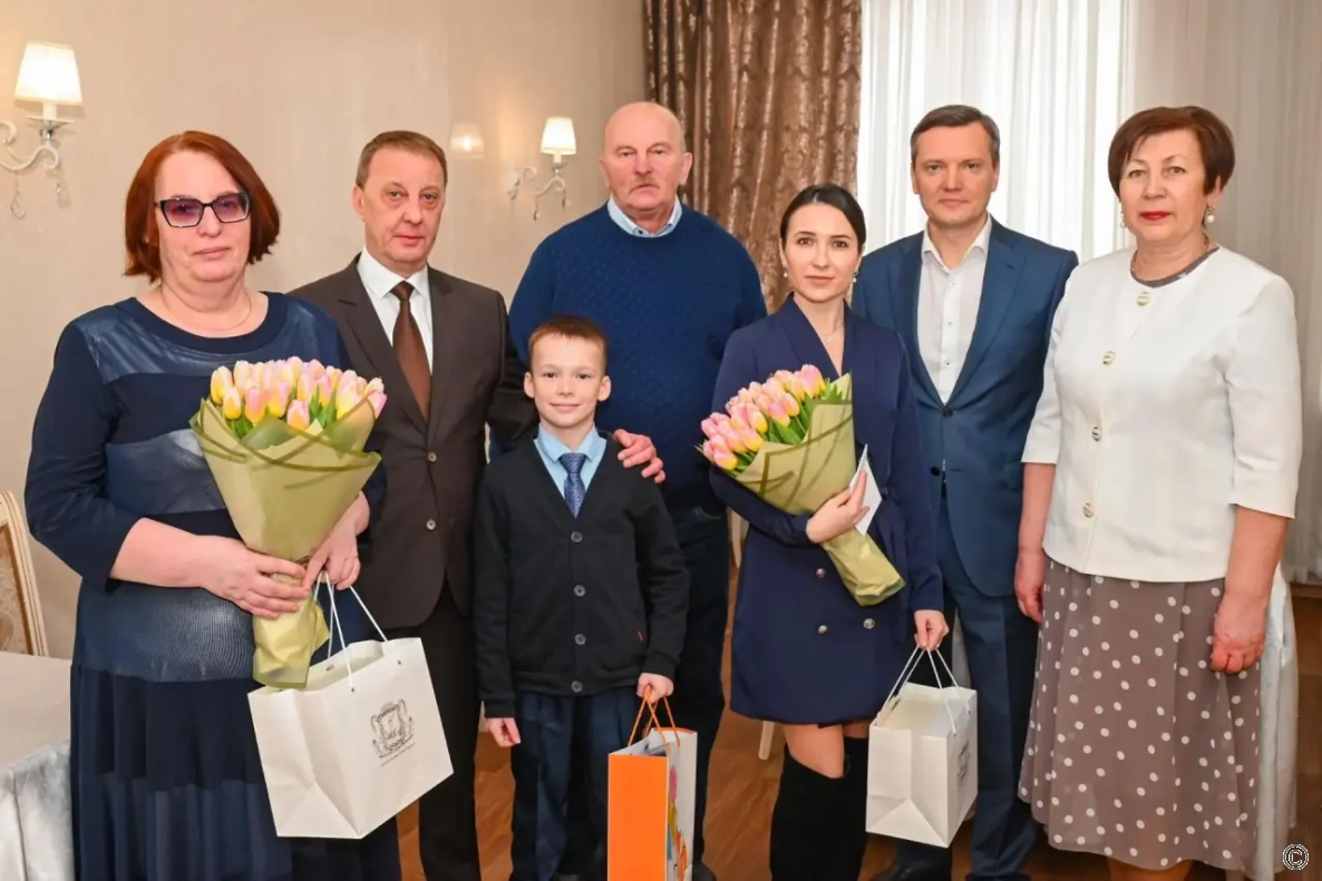 Вячеслав Франк и Даниил Бессарабов поздравили с наступающим праздником женскую половину семьи, пожелав им счастья, любви и благополучия, вручили им цветы и памятные подарки.