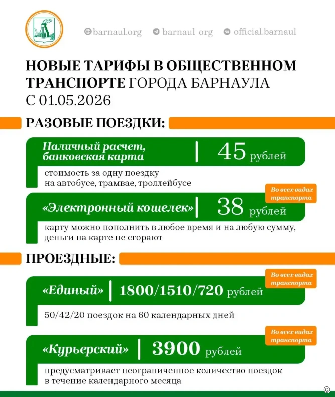 Новые тарифы в общественном транспорте города Барнаула с 01.05.2026