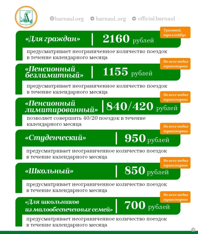 Руководитель «Центртранса» Арина Бегаева добавила, что Барнаул является единственным городом в Алтайском крае, где действует широкая линейка тарифных планов для пассажиров, которая предоставляет возможность выбрать оптимальный для каждого вариант.