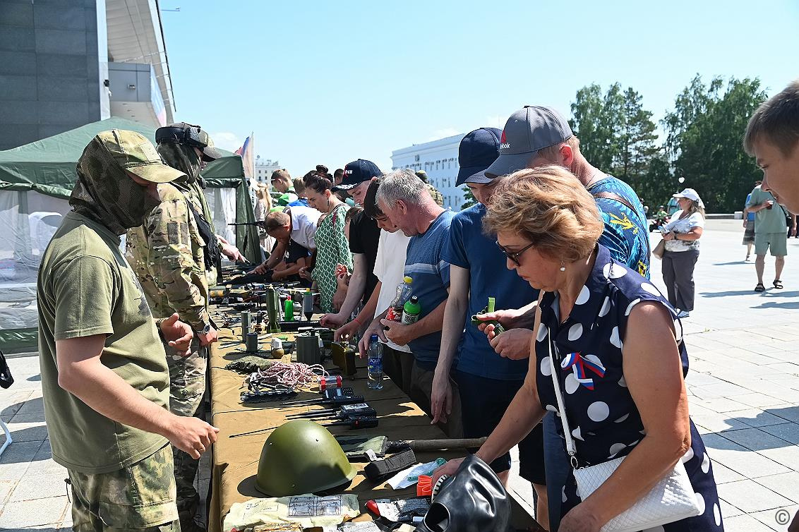 Молодежная площадка праздника «Россию строить молодым» была разбита не несколько тематических зон. У театра драмы разместился Пункт отбора по контракту на военную службу. Здесь любой желающий, в том числе, жены или родители бойцов СВО, могли узнать о том, какие региональные и федеральные выплаты положены военнослужащему по закону.