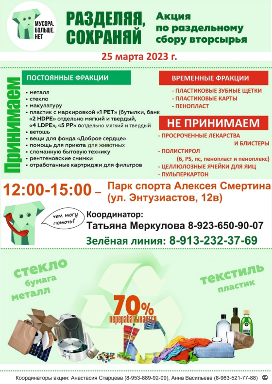 В субботу, 25 марта, в Барнауле традиционно состоится экологическая акция по раздельному сбору отходов «Разделяя, сохраняй!».