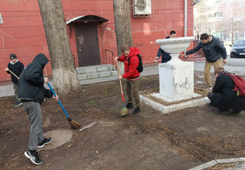 Учащиеся Алтайского училища олимпийского резерва убрали прилегающую территорию от мусора и прошлогодней листвы у стелы в честь названия улицы именем Н.Г. Чудненко.