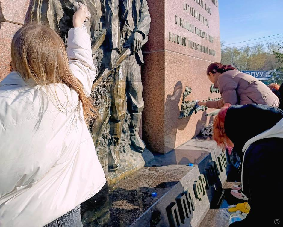 Памятный камень вдовам погибших участников Великой Отечественной войны 1941-1945 гг. помыли студенты Алтайского государственного педагогического университета.