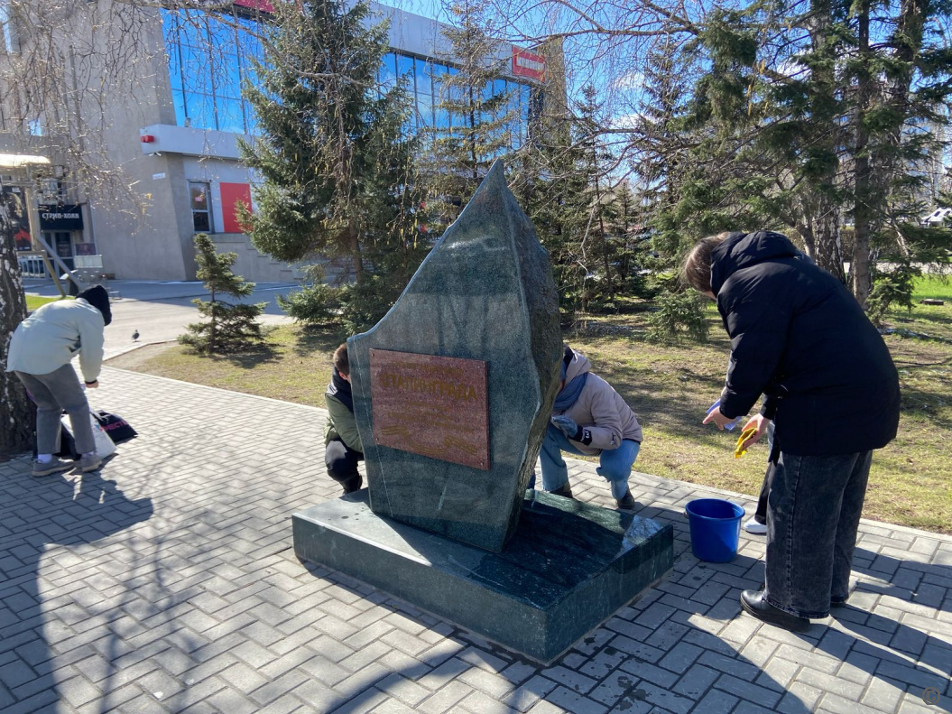 Так, студенты Международного колледжа сыроделия и профессиональных технологий помыли стелу эвакуированным заводам в годы Великой Отечественной войны.