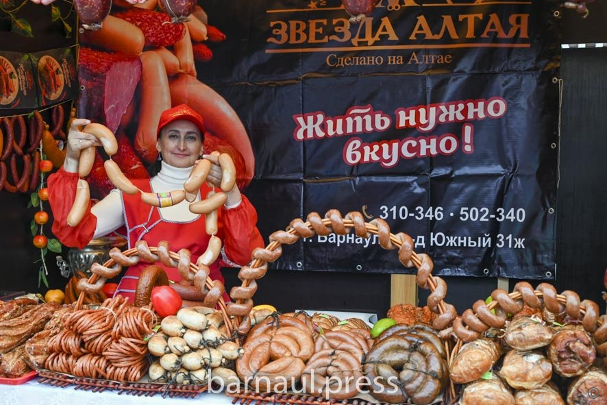 Участники старательно подошли к оформлению торговых мест. Так, прилавок мясоперерабатывающего завода "Звезда Алтая" привлекал не только аппетитными колбасами, но и оформлением в русском-народном стиле - с самоваром, корзина, цветами. Улыбчивые продавцы - в стилизованных нарядах.