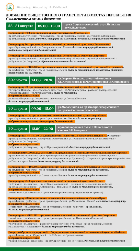 В этом году город Барнаул отмечает юбилейный 295-й День рождения. Масштабные праздничные мероприятия, посвященные этому событию, пройдут в краевой столице 30 августа. В связи с их проведением необходимо ограничить движение транспорта на нескольких участках дорог в центре города: