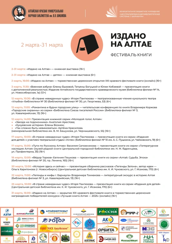 Напомним, что XXI Краевой фестиваль книги «Издано на Алтае» открылся 2 марта в Алтайской краевой библиотеке им. В. Я. Шишкова. В этом году программа фестиваля включает более 200 событий в библиотеках региона, в том числе в муниципальных библиотеках Барнаула.