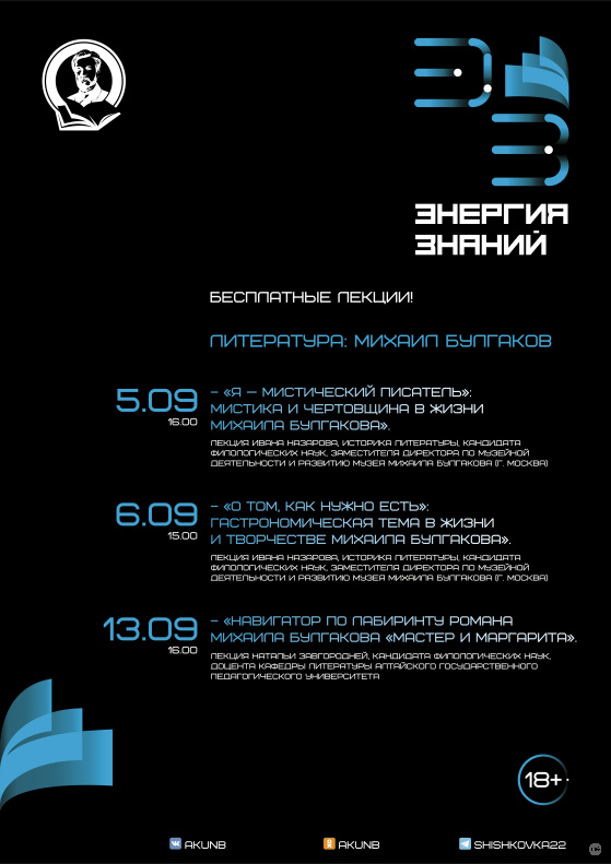 С 5 сентября в Алтайской краевой библиотеке им. В. Я. Шишкова начинается двенадцатый сезон просветительского проекта «Энергия знаний». Публику ждут три лекции, посвященные самому популярному писателю у молодых читателей библиотеки – Михаилу Булгакову и его роману «Мастер и Маргарита». Две из трех лекций прочитает эксперт из Москвы.